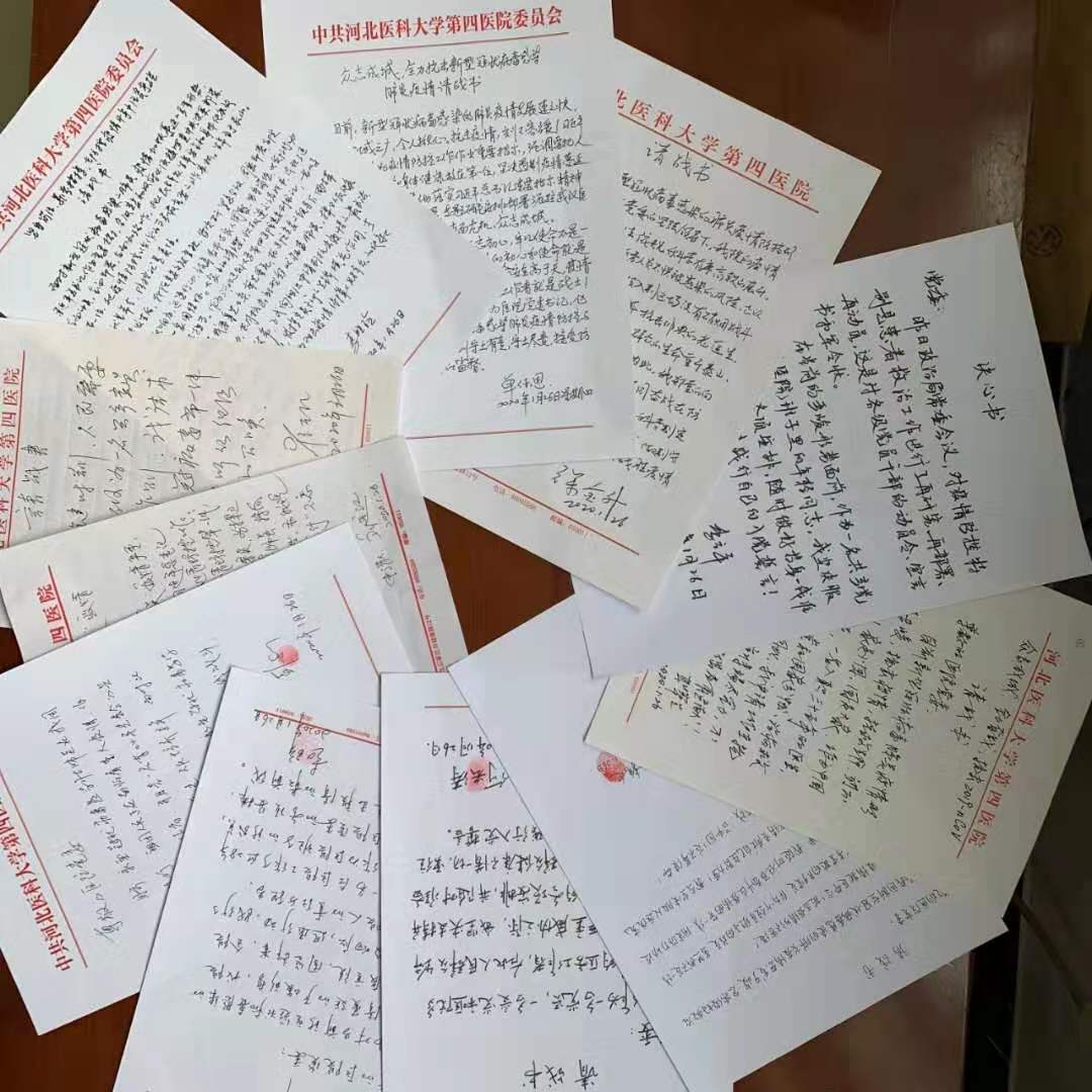 党委书记单保恩第一时间递交了请战书,他言辞恳切,“人民群众的生命安全高于天,疫情就是命令,防控就是责任,我们医务工作者就是战士,必须勇敢地冲向战场。我作为医院党委书记,必须坚持在抗击新型冠状病毒感染的肺炎疫情防控与救治工作的最前线,必须做到守土有责,接受防控斗争的考验和大家的监督。”徐金升院长也率先垂范,积极请战,“作为一名曾经参与2003年抗击非典的老医生,同时作为医院院长,深知人民群众的生命重于泰山,疫情就是命令,防控就是责任。为此,我郑重向医院党委申请:及时掌握疫情,科学制定我院防控预案,并认真组织实施落实,做到守土有责。在医院党委的正确领导下,为最终战胜疫情贡献自己的力量。”医院其他院领导也积极递交了请战书。在院领导的感召下,全院上下掀起了请战热潮,涵盖了临床、医技、护理、药学、行政后勤等各个科室,请战书如雪片,全院抗击疫情的斗志昂扬,有的人专程从老家赶回来,有的还处于哺乳期,有的是夫妻共同请战,他们纷纷要求到一线去,要到最需要的地方去!不计报酬!不论生死!坚决服从组织安排,随时听候调令!