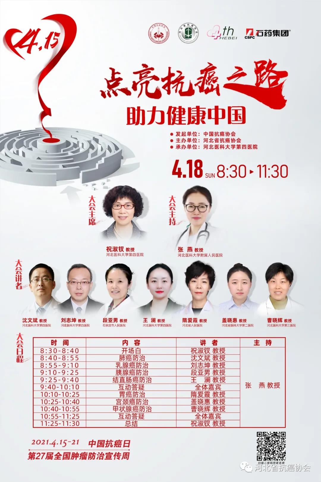 在为期一周的活动中,河北省抗癌协会、河北省癌症中心、各专业委员会、各市抗癌协会都将相继举办形式多样的防癌科普宣传,以医务工作者火热的爱心点亮抗癌之路,助力健康中国!