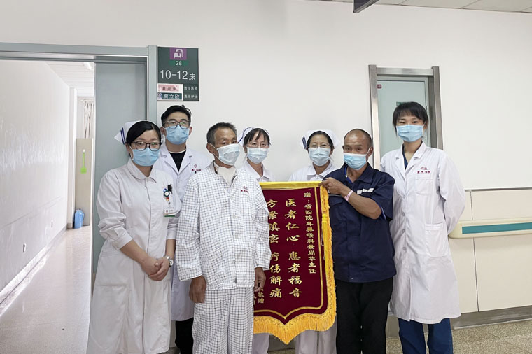 10月18日,康大爷平安出院,踏上了返回家乡的路。临别时,他托家人送来了一面锦旗,向贴心照看他的医护人员表示致敬,且不停地抹眼泪,颤颤巍巍地举起大拇指,“谢谢,谢谢耳鼻喉头颈外科的医生、护士……”