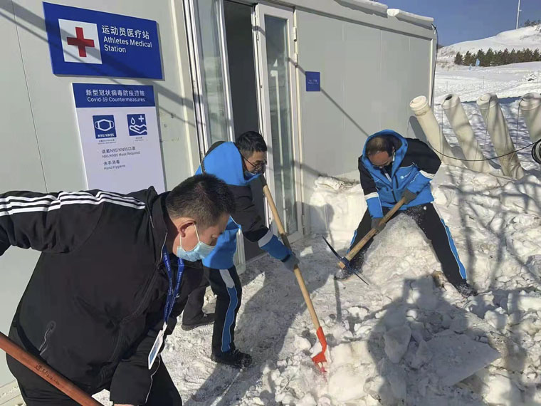 此前,我院两位医疗官已到达崇礼场馆核心区工作1月有余,进行了大量的前期筹备工作,包括协调各业务领域对接、保障方案的制定、医疗站点物资准备、人员安排,远程指导培训演练等。两位医疗官冒着严寒铲雪,不断优化医疗站和周边环境,为冬季两项训练周及冬奥会医疗保障工作提供了有力的支持。