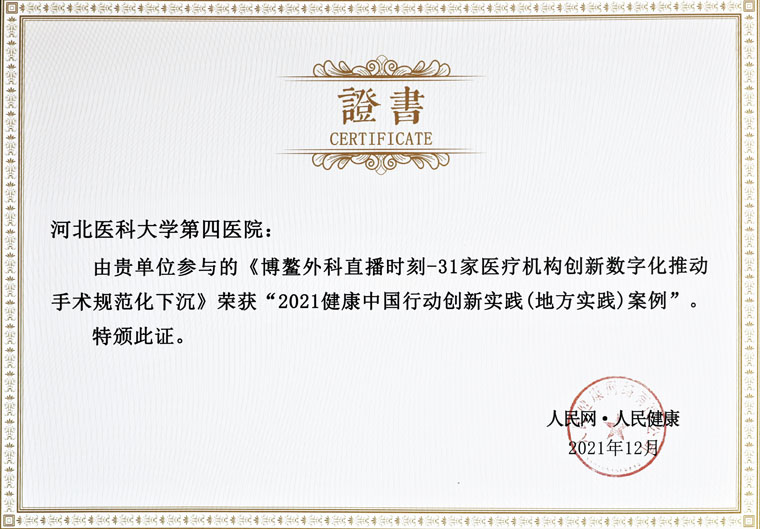 近日,我院荣获由人民网主办、人民健康承办的“2021健康中国行动创新实践(地方实践)案例”奖。该奖项来源于《博鳌外科直播时刻-31家医疗机构创新数字化推动手术规范下沉》活动,此前,我院胸外科、外二科、外三科、妇科、泌尿外科及手术室在3天的时间里为全国同道奉上了涵盖达芬奇机器人手术、全腔镜食管癌根治术、腹腔镜下筋膜外全子宫双附件切除术等58台高水准的外科手术直播,线上观看量超7.8万人次,得到业内广泛关注和赞誉。