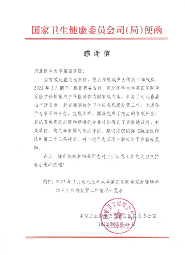 近日,根据国家卫生健康委员会部署,我院重症医学科胡振杰主任作为国家级专家赴唐山市迁安市对一起交通事故进行卫生应急现场处置工作,并圆满完成了上级交办的各项任务。他认真负责的态度和精湛的专业技能得到了当地政府、有关单位、伤员和家属的高度评价,展现了我院在卫生应急工作方面过硬的能力和水平。