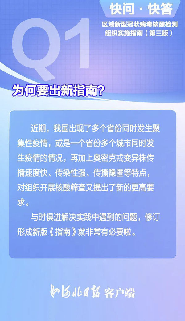 近日,国家卫生健康委发布《区域新型冠状病毒核酸检测组织实施指南(第三版)》,强调核酸检测应该目标明确、有的放矢,不能搞“一刀切”;明确推进“抗原筛查、核酸诊断”的监测模式……
