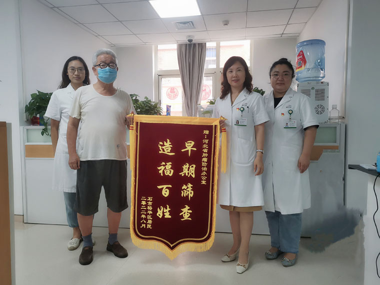 今年6月,河北省肿瘤防治办公室组织结直肠癌高危人群来我院内镜室进行结直肠镜筛查,内镜室专家发现一例“结直肠早癌”患者,取活检送病理后,诊断为“灶性腺上皮重度异性增生”。河北省肿瘤防治办公室副主任贺宇彤将患者的情况反馈给外二科周超熙副主任医师,使患者得到了及时有效的治疗,术后病理分期为Ⅰ期。这对患者来说,既缓解了经济压力,又提高了生活质量。患者家属带上写有“早期筛查,造福百姓”的锦旗,送到河北省肿瘤防治办公室表达感谢。