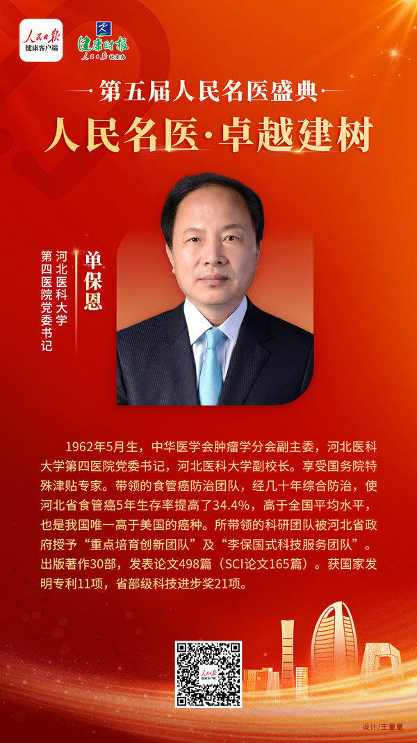 单保恩教授是享受国务院特殊津贴专家、全国优秀科技工作者、全国优秀院长、国家五一劳动奖章获得者、河北省高端人才、省十大优秀发明者。是中华医学会肿瘤学分会副主委、国际肿瘤基因与细胞治疗学会候任理事长,在中国抗癌协会、中国免疫学会、中国诱变剂学会等国家一级学会任常委。