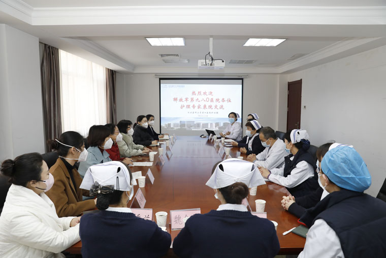 214日,解放军第九八〇医院外科总护士长刘金凤带领各专业的护理同仁到我院参观交流,护理部主任李来有、门诊部主任安波、医疗服务中心主任王书新及护理部成员、部分科室护士长陪同,大家就护理事业的高质量发展进行深入交流。