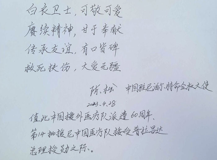 我们的工作得到了我国和尼泊尔政府的高度认可。2023年2月,第14批援尼泊尔医疗队获得国家卫健委的通报表扬。2023年4月,尼泊尔总理普拉昌达给我们颁发了尼泊尔“国家健康卫士”荣誉勋章,并同陈松大使为我们欣然题词;同月,中国驻尼泊尔大使馆陈松大使到访BP柯依拉腊纪念肿瘤医院。在听取了关于移植工作的详细汇报后,他对我们的工作表示充分肯定,尤其当听到我说,“我们医院党委高度重视该项工作,要求以国际化视野严格掌握标准,要经得起历史的检验”,大使深深点头,表示赞许。