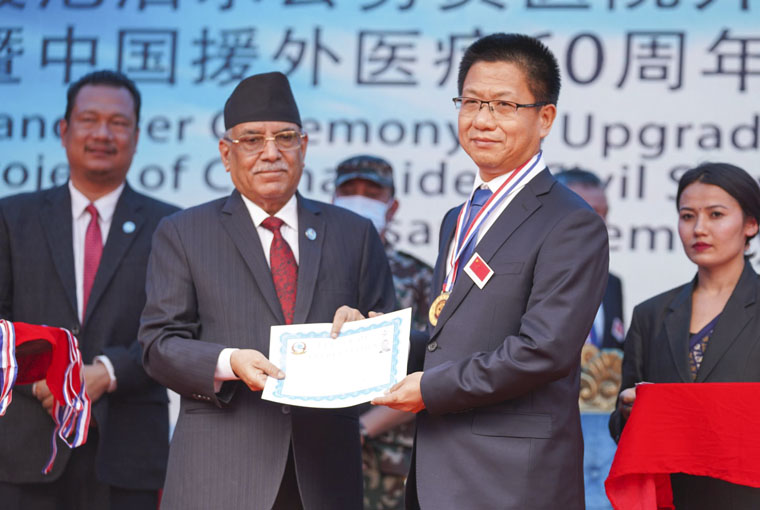 (尼泊尔总理普拉昌达向刘海生颁发“国家健康卫士”荣誉勋章和证书)