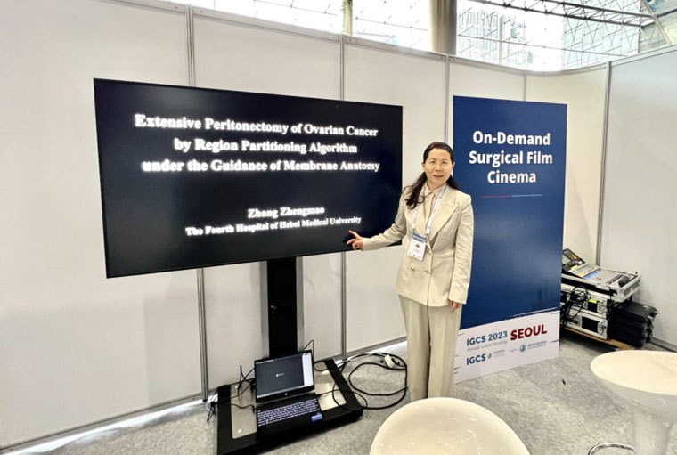 晚期卵巢癌患者的治疗一直都是妇科肿瘤学界的重点和难点,张正茂教授团队攻艰克难,使晩期卵巢癌的R0(肉眼无残留病灶)切除率达到95%以上,平均无进展生存期达到了26.5个月。本次IGCS 2023会议循环展示播放的《膜解剖理论指导下的晚期卵巢癌广泛性腹膜切除术》是卵巢癌R0手术彻底性的充分体现,使卵巢癌这一高难度的手术实施更加精准、彻底、高效,展现了我院妇科团队成员精湛的技术水平和肿瘤外科理论功底。
