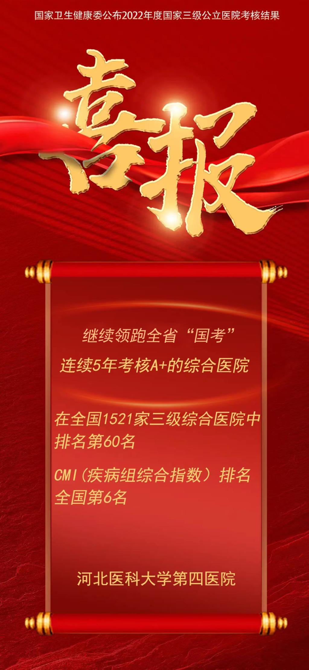 1月8日,国家卫生健康委公布了2022年度全国三级公立医院绩效考核结果,我院再创佳绩,在全国1521家三级综合医院中排名第60名,其中,CMI值位居全国第6,代表我院诊治疑难危重疾病的技术能力方面达到国内领先水平。我院连续5年考核获得A+,是连续3年进入全国前100名的综合医院,今年继续领跑我省“国考”成绩。