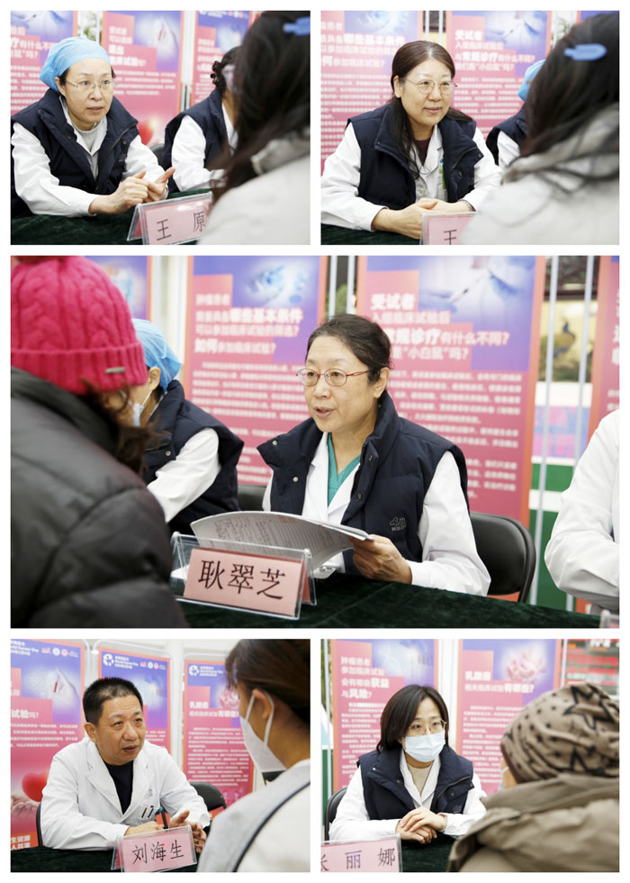当日上午,中国抗癌协会肿瘤临床研究管理学专业委员会和河北省抗癌协会乳腺癌专业委员会在我院东院门诊大厅联合开展以“整合卫生资源,医疗人人共享”为主题的义诊活动,现场服务200余人次。乳腺中心耿翠芝教授、临床药理研究部主任王明霞、血液内科副主任刘海生、内分泌副主任王原、乳腺中心张丽娜医师、I期临床研究室李璇医师等参加。专家们耐心倾听患者和家属的困惑,详细询问病史和症状,并根据实际情况给予个性化的建议和治疗方案,对前来咨询的群众提供耐心细致的解答,并介绍了相关疾病前沿的治疗方法及临床试验的知识。