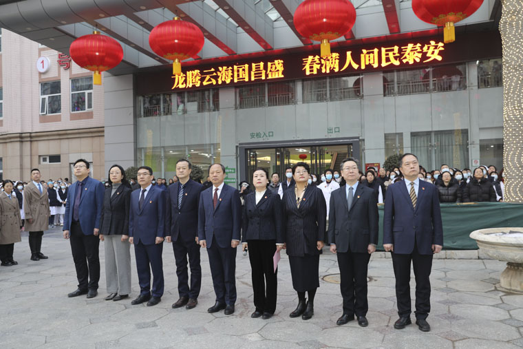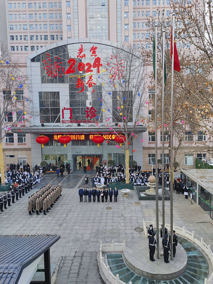全体院领导向大家拜年,表达美好祝愿。随后,两院区在前庭广场举行了隆重的升国旗、升院旗仪式。