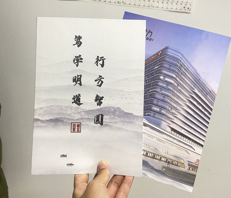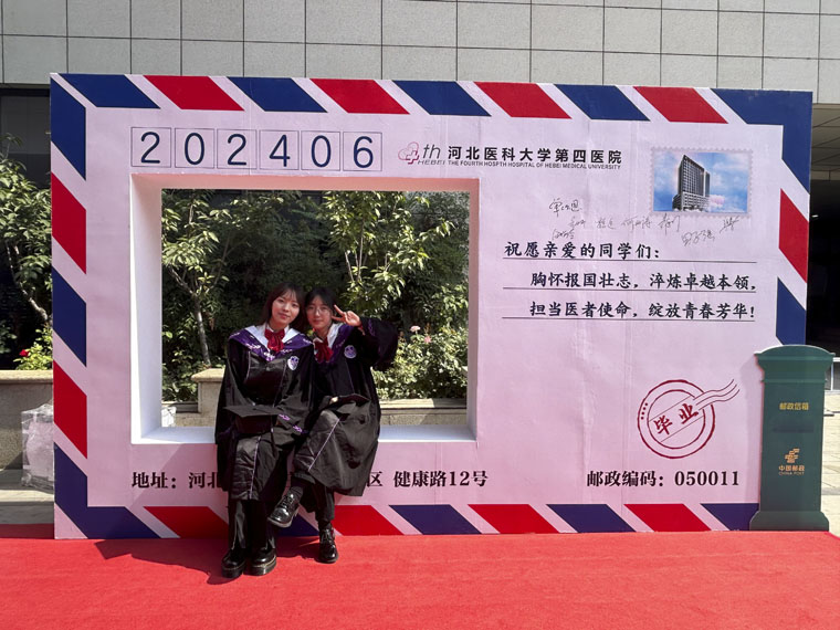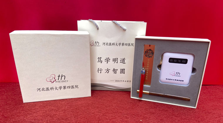 毕业纪念品经过精心设计,由烫金书签、签字笔、充电宝和明信片组成,并印有河北医科大学第四医院的标识。教务处悉心准备了医院文创元素的印章,希望同学们前来集邮,意在嘱咐每一位毕业生不忘初心,奋勇向前。明信片造型的拍照展板寓意扬帆起航,逐梦未来。