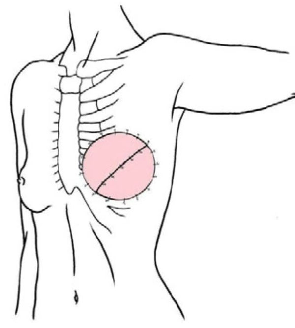 科室医务人员在讨论中表示,如果切除左侧乳房及全部受累皮肤,胸壁将留下巨大缺损;如果不切除受累皮肤,将面临极高的局部复发风险的情况,且此类患者术后需要放化疗,采取快速可靠方法修复创面缺损具有重要意义。考虑传统的背阔肌皮瓣因背部皮肤弹性较差,患者可能还需要再次进行植皮修复,回天立副主任医师提议为王女士进行左乳癌改良根治术+Kiss背阔肌皮瓣移植术,这样既能达到肿瘤的原发灶姑息性切除目的,又能避免低质量的植皮,为患者后续的放疗创造良好的条件。