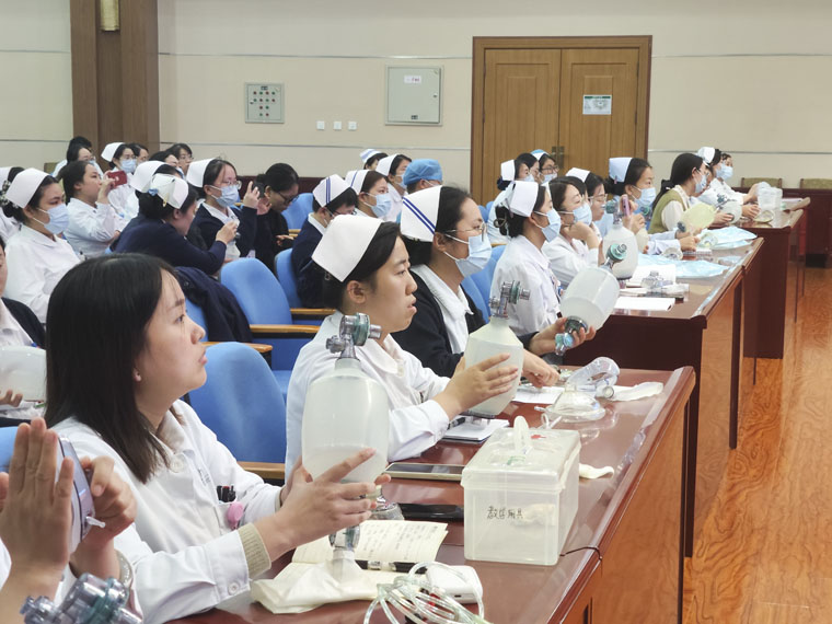 急诊科邢冬副主任医师以《心脏骤停患者抢救实施过程》为题,讲解了患者呼吸心脏骤停的病因、临床表现、心电图特征、早期识别、初级生命支持的流程、高质量心肺复苏的关键、进一步生命支持、团队配合等内容;急诊科钱勇主管护师讲解了简易呼吸器的结构并演示检测流程,现场和东院会场多名青年医护人员主动参与,在钱勇的指导下进行练习,并开展了一场简易呼吸器的组装与检测竞速比赛。