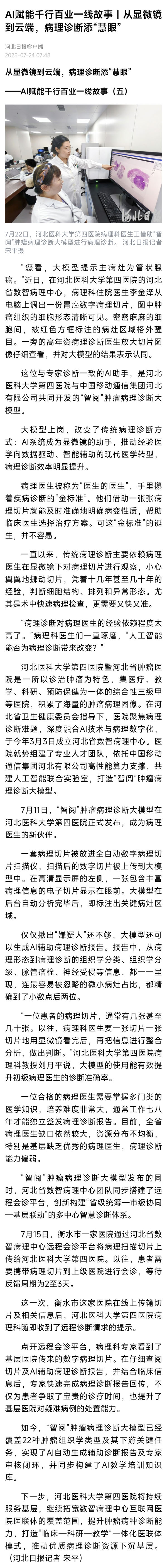 权威关注!河北日报+健康报深度追踪我院肿瘤病理诊断大模型:为肿瘤诊疗装上“慧眼”