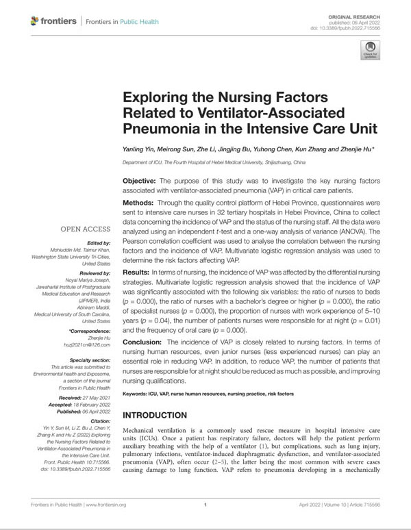 护理人员的科研能力亟待增强,在科室负责人胡振杰和护理部主任李来有的支持下,科室在2018年成立了护理科研小组,尹彦玲护士长带领着以吴彦烁为组长的科研团队,从临床中汲取思路,不断开拓创新,大力培养护理人员的科研能力。截至目前,ICU护理团队已经发表SCI论文3篇,中文核心期刊论文20多篇。其中尹彦玲护士长以第一作者发表SCI 2篇,吴彦烁在中华护理杂志发表论文2篇。尹彦玲护士长主持及参与编写书籍4部,包括人民卫生出版社出版书籍一部。目前,ICU护理科研团队已初步搭建完成,正在不断深入推进。